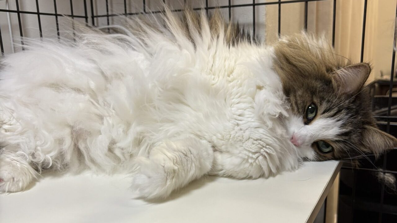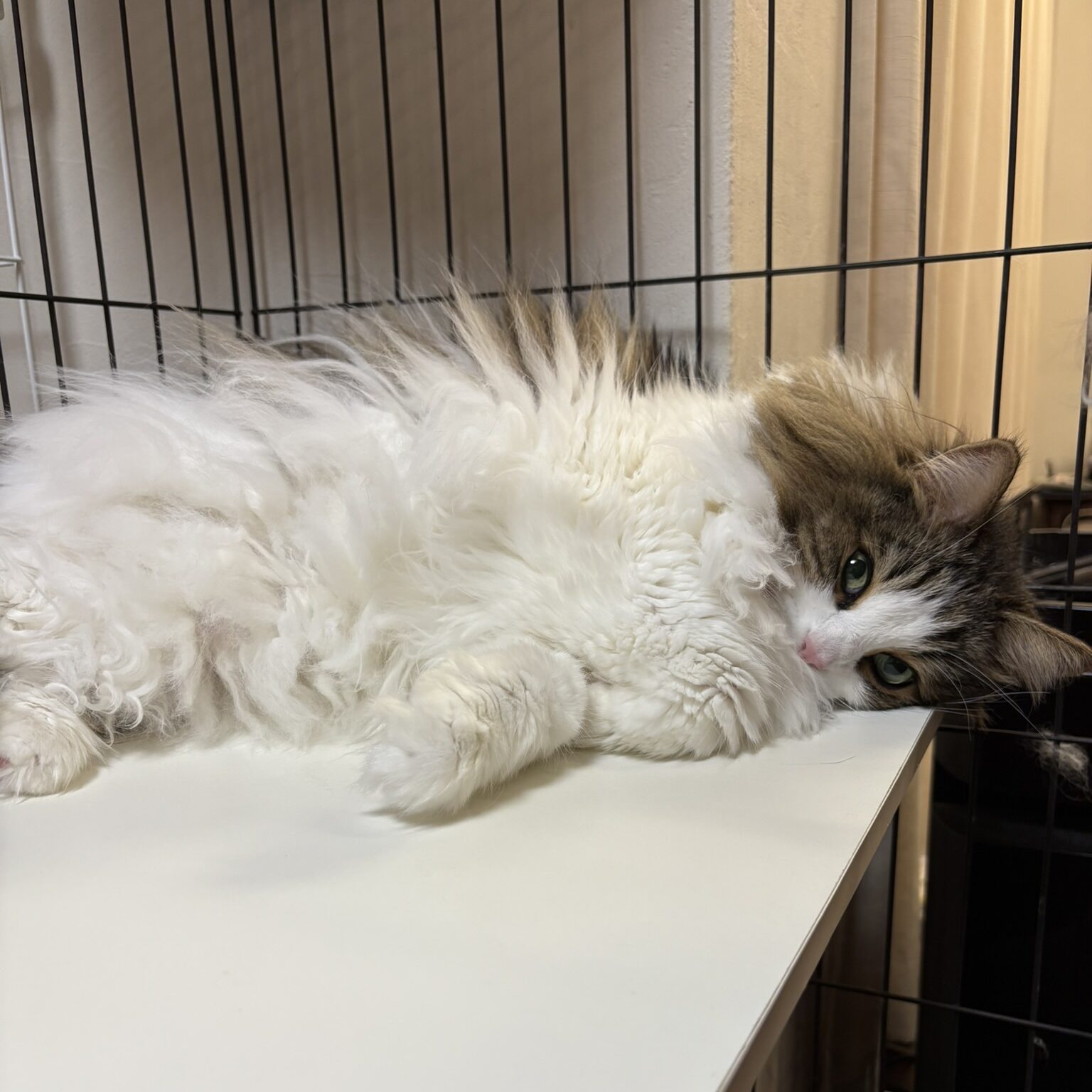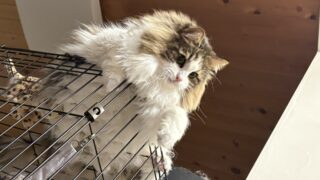 これは、ケージの白い棚の上で気持ちよさそうに横たわるれおんさんです。ふかふかの毛並みに包まれて、すっかり夢の中。この棚は、彼女にとって特別な「特等席」のようで、いつもここで熟睡しています。一体どんな幸せな夢を見ているのでしょうか。その寝顔を見ていると、こちらも自然と心が和みます。
