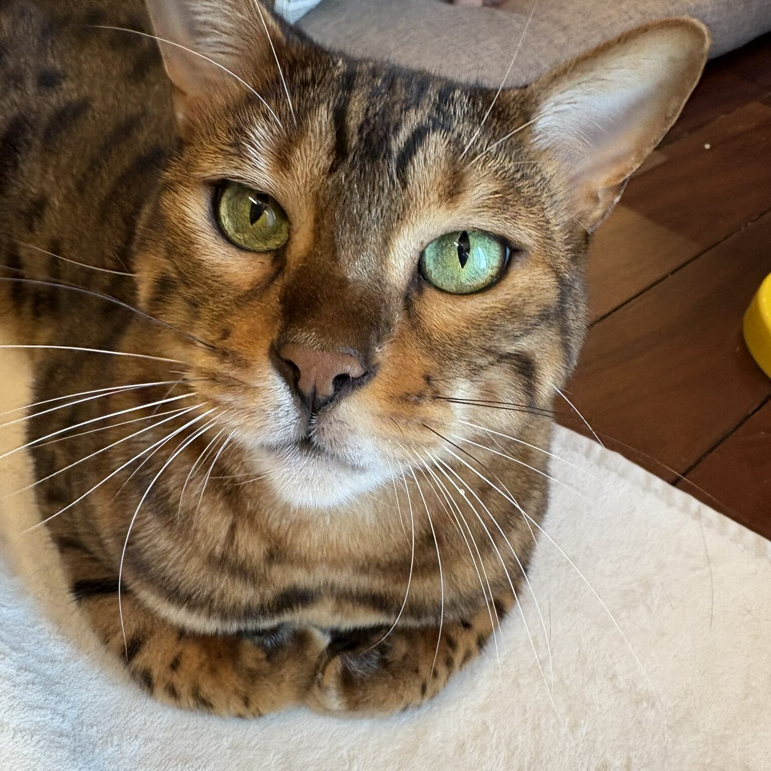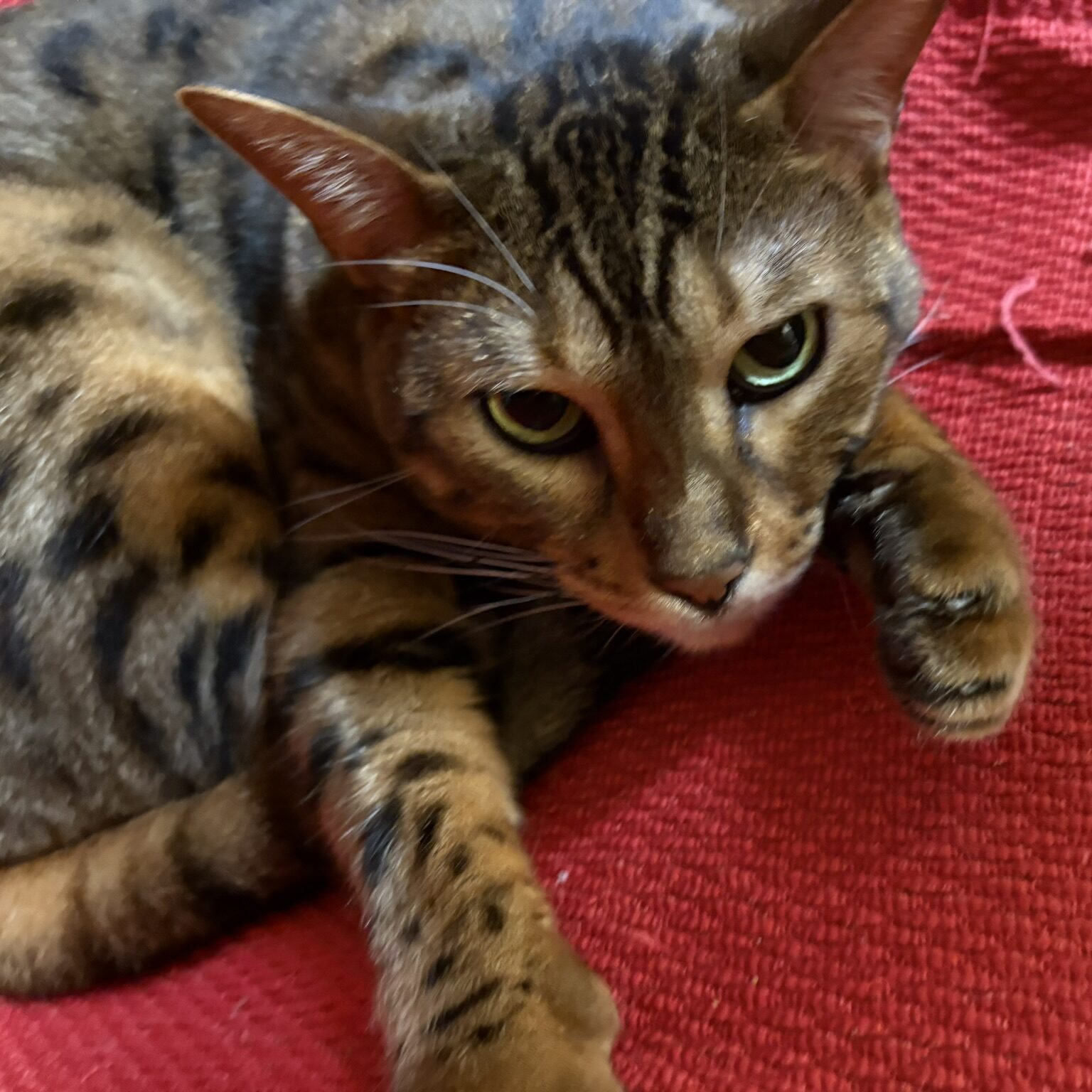 かのんさんは、赤いブランケットの上でくつろぐのが大好き。このエメラルドグリーンの瞳でじっと見つめられると、つい「どうしたの?」と話しかけたくなります。一見クールに見えますが、実はとても甘えん坊で、撫でてほしくてこんな表情をすることがよくあります。
