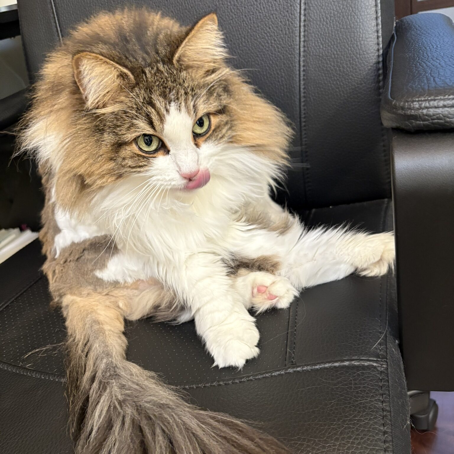 そして、また別の日のれおんさん。今度は、まるで人間が座るように椅子に座って毛づくろい中! こんな風に器用に座って舌をペロッと出す姿は、何度見てもクスッと笑ってしまいます。彼女の自由奔放な姿には、いつも驚かされますね。